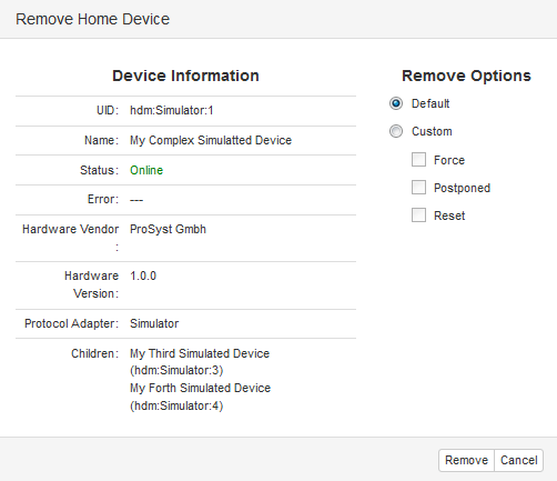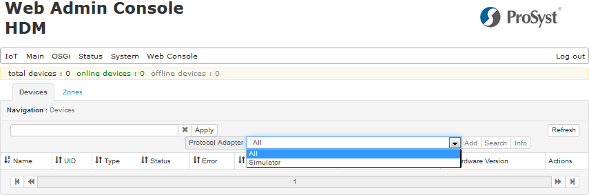The Devices tab of the HDM page shows the devices registered in the Home Device Manager. Here, depending on the capabilities of the relevant protocol adapter, you can request initialization information from a device by executing an "add" operation, force the adapter to perform a search for devices with specific features, and remove devices.
