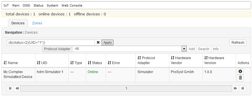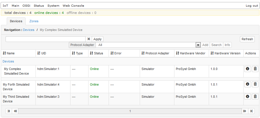 The devices are arranged in a table which shows their main characteristics, such as UID, name, responsible adapter, etc. The options in the Actions column allow you to check the device details and to execute a command on device's device class objects, and to remove the device from the system.