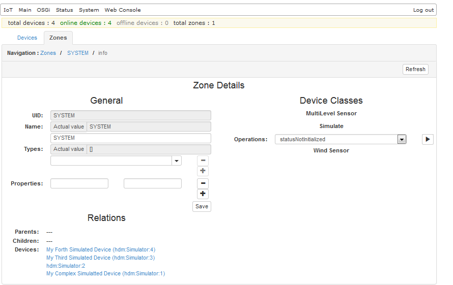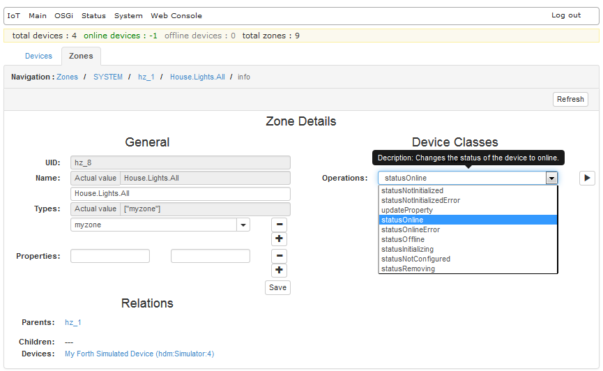 For zone information and management operations, go to the Zones tab of the HDM page in the Web Admin Console. The tab shows the zones in the Home Device Manager by name in a tree manner. For each zone, you can view its properties and the devices it contains.