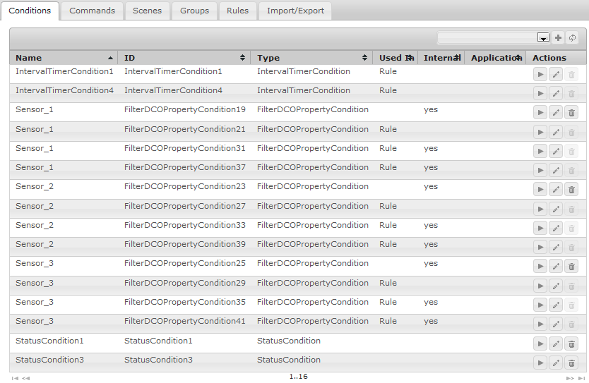 The Home Automation page, named Old Rules shows the available automation components in the Web Admin Console grouped by type - Conditions, Commands, Scenes, Groups and Rules.