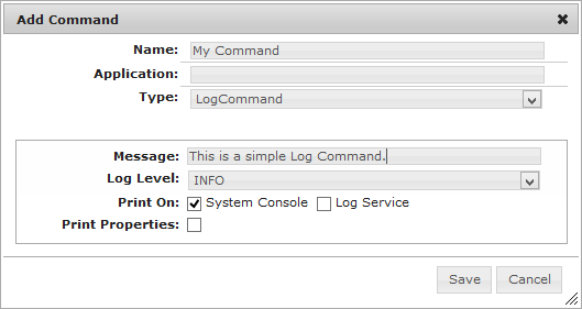 The Log Command sends log messages to the OSGi Log Service and to the system output.
