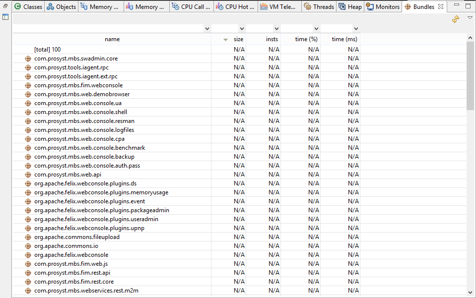 To view general performance information about the bundles in the OSGi runtime, open the Bundles view in the mBProfiler perspective by clicking Window > Show View > Bundles from the main menu bar. The view shows a table of bundles, represented by symbolic name, and summarized profiling data collected about them. To refresh the information about the bundles on the runtime, use the button.