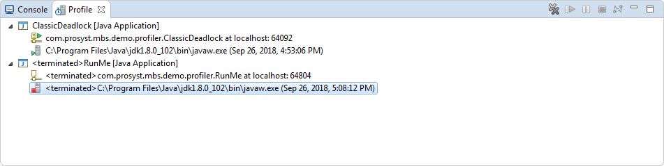 Since mBProfiler supports profiling several local or remote applications from the same Eclipse frontend, it also provides a convenient way to switch between the processes, monitor and control the execution of the corresponding launch configurations, from a central view – Profile. Once a profiling process is started or connected by mBProfiler via the relevant launch configuration, you can control the profiling execution, that is, relaunch, suspend, etc.