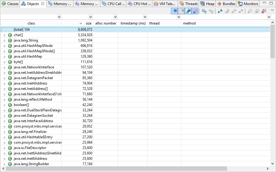 mBProfiler allows you to filter the displayed profiling data thus allowing you to analyse it on smaller portions. For example, you can examine the allocated memory only for the classes part of the java.util package. The fields where you can enter filters are located at the top of each table column of each view except for VM Telemetry.