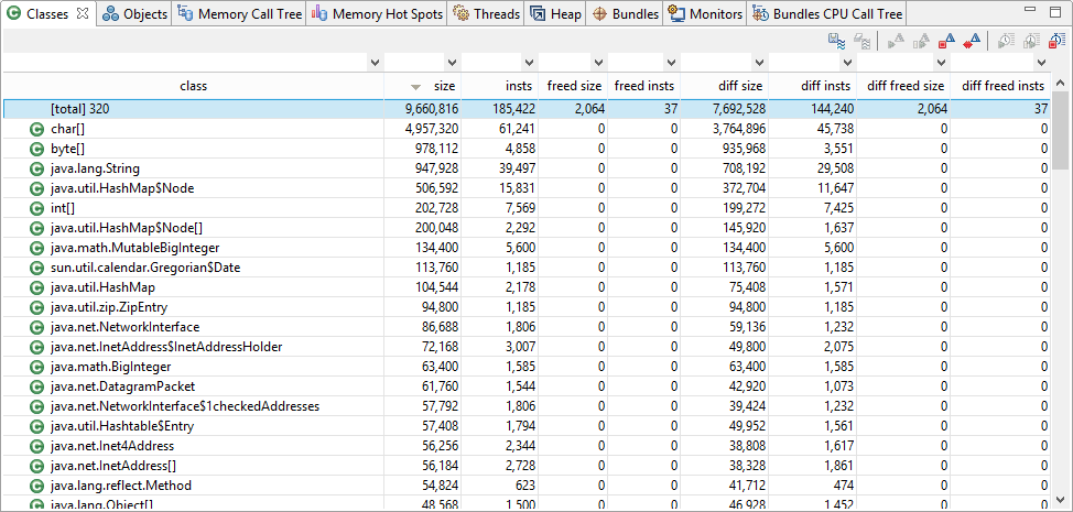 ) toolbar option. The diff size, diff insts, diff freed size and diff freed insts columns in the Classes, Memory Call Tree and the Memory Hot Spots views will start to display the changes occurring in the measurements of the allocated objects: