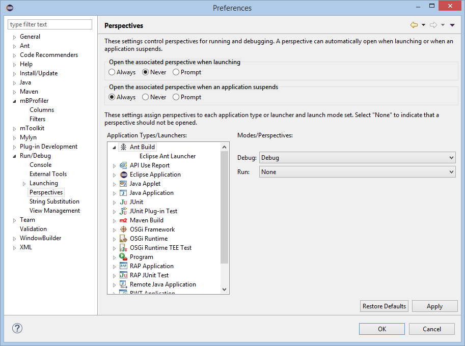 Another preference concerning the mBProfiler perspective is the View Management. To enable the automatic view opening when mBProfiler perspective is loaded, check the mBProfiler option in the Perspective pane. The Do not automatically open/close views which have been manually closed/open option controls weather all views that where manually closed/opened will remain closed/opened next time they are used. However, this setting does not affect the Heap and the Monitors views, as they are always opened.
