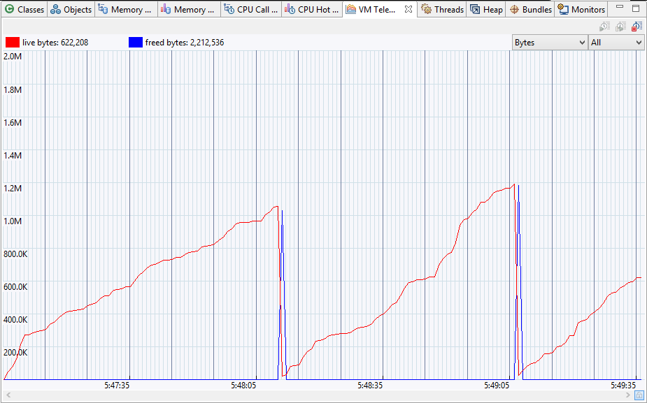 The Bytes graph visualises allocated bytes and the transitions in memory during garbage collection operations. The Bytes graph contains data only if memory profiling is started as well – see Starting/Stopping Memory Profiling.
