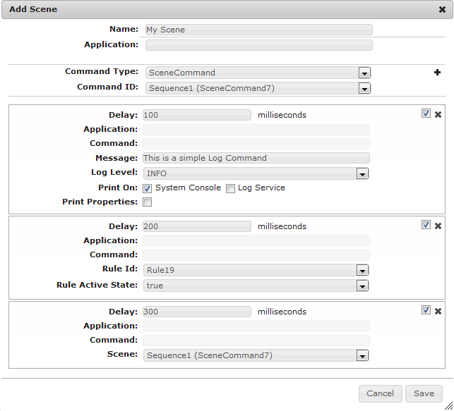 Use the checkbox next to the to indicate whether this command should be enabled/disabled during the scene's execution. For example, you can uncheck the box temporarily if you know that the command will take quite a long time for its execution and thus slow down the whole scene execution. In order to execute the scene quickly, you can start it with this specific command disabled. You can enable it at any time later by simply checking the box.