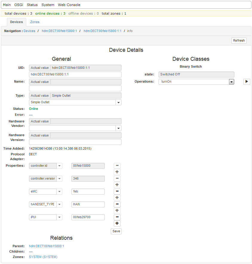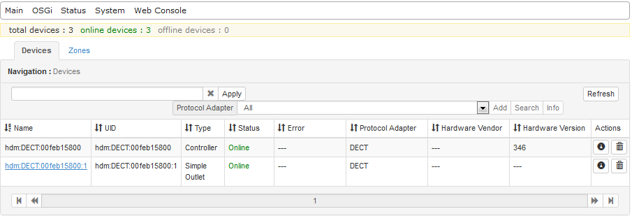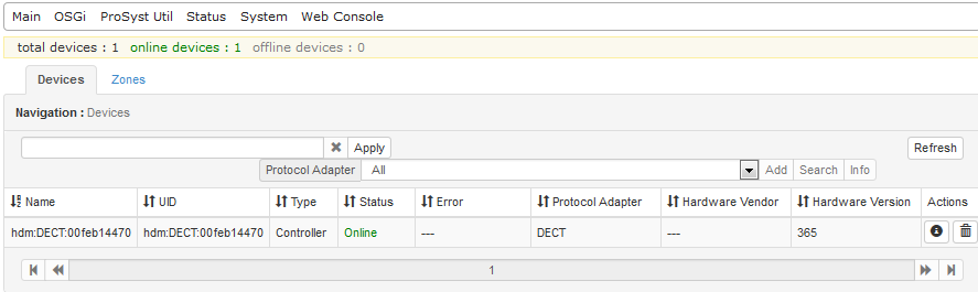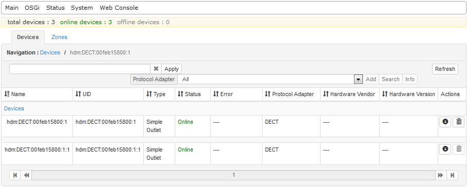 After setting up the environment open the Web Console page in a browser, log in and click the Home Devices tab. This opens the Home Devices page with the Devices tab selected by default. In the Devices page select DECT from the Protocol Adapter box to filter out only the available devices that communicate over the DECT protocol. The Devices tab of the Home Devices page shows the devices registered in the Home Device Manager. Here, the capabilities of the relevant protocol adapter are limited. It does not support "add", "search" and "remove" operations.